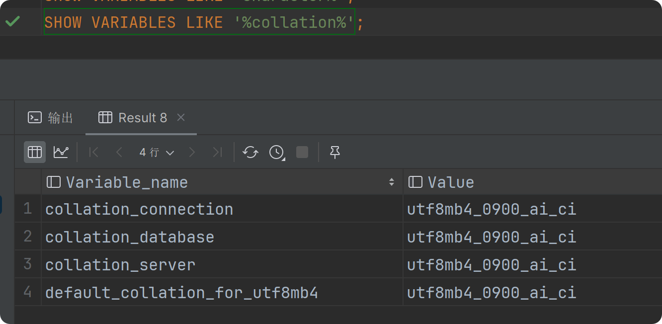- utf8mb4_0900_ai_ci 是MySQL8.0引⼊的新规则,在老版本中不能识别;